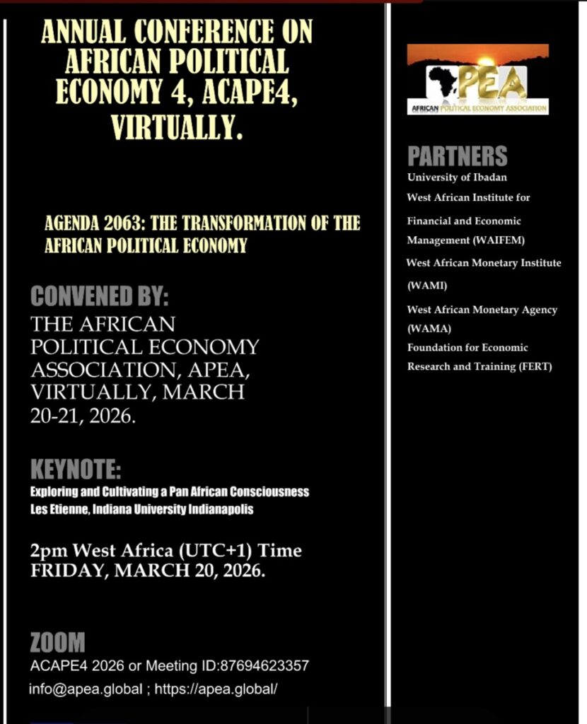 The African Political Economic Association (APEA) will host a virtual 4-day international conference on African Political Economy 4 (ACAPE4) from March 20, 2026, to March 23, 2026.