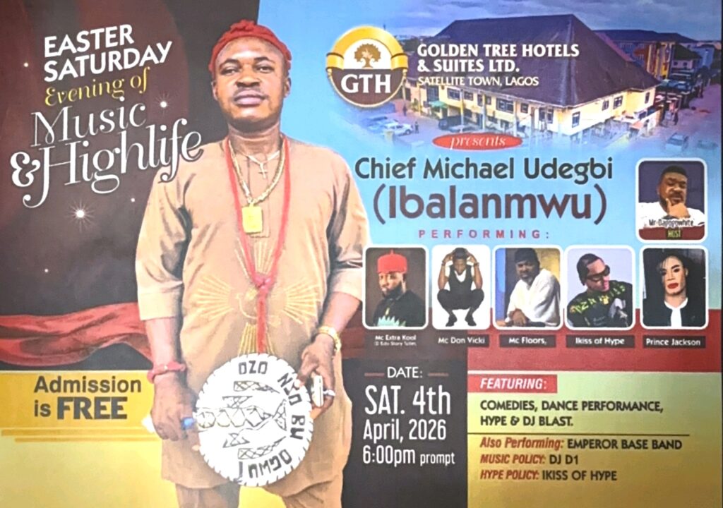 Golden Tree Hotel is again set to groove 2026 Easter Saturday as legendary Chief Michael Udegbi, Nigerian Highlife maestro, takes center stage at the highly anticipated “Easter Saturday Evening of Music and Highlife.”