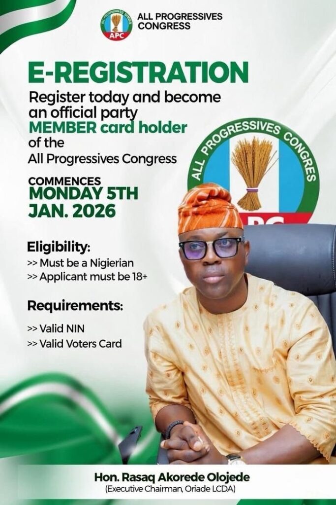 The executive Chairman of Oriade LCDA in Lagos, Hon. Rasaq Akorede Olojede has urged the people of the area to embrace the ongoing All Progressives Congress (APC) membership e-registration in the state.